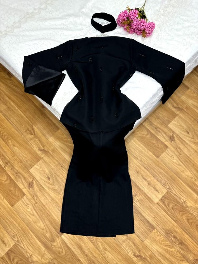 فستان اسود قطعتين فخم يتميز هذا الفستان بقماش ناعم وقصته التي تنسدل بشكل أنيق على الجسم. كما يتميز بالموديل الجذاب التي تُضفي لمسة من الإثارة على المظهر.